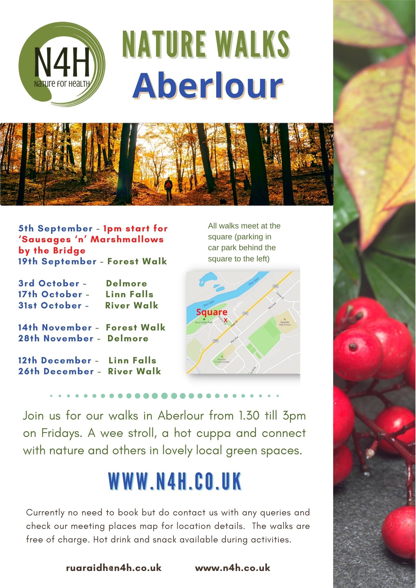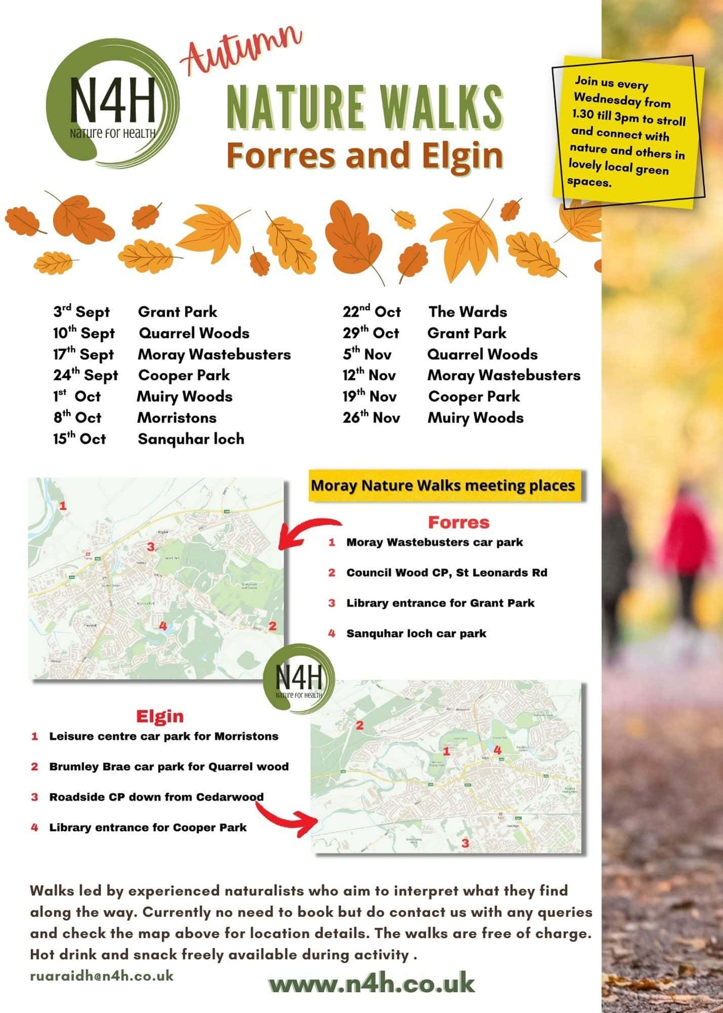 Nature Walks for Wellbeing are 90 minute sessions that use nature walks to provide mindful nature-based therapy to those suffering from poor mental health, and those just taking care of themselves. Participants meet at a pre-determined location in Nairn/Aberlour, Inverness and Moray each week, with different leaders each week to provide varied activities. The sessions emphasise experience in and benefiting from, nature. Art, storytelling, poetry, nature tracking and wildlife watching may form part of the session and mindfulness activities are a regular focus. As part of the walk, the group have tea made on a fire with a wee snack and the chance to chat together in a beautiful natural spot. Always a very slow and gentle walk, so hiking boots definitely not required!